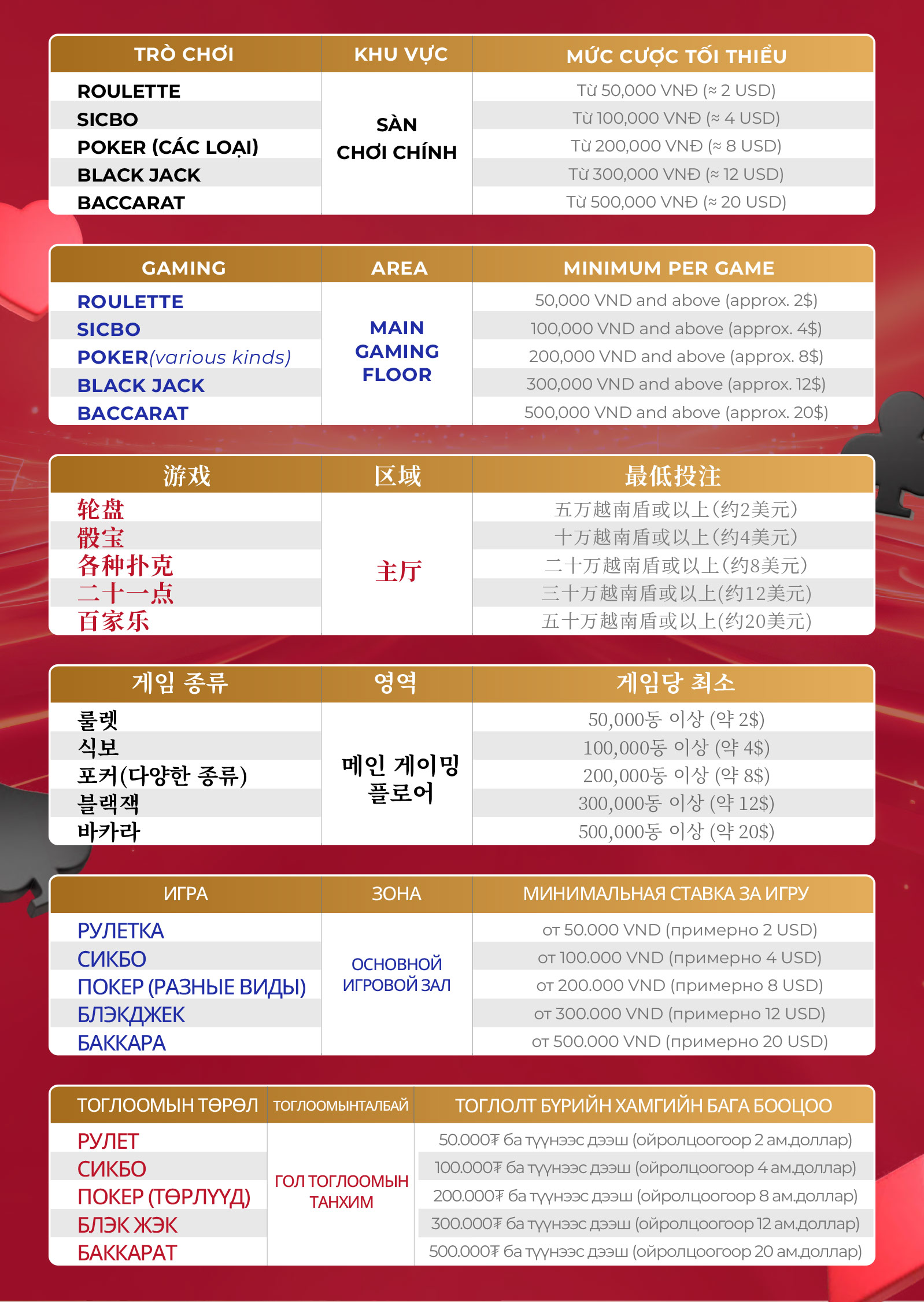 III. Thông tin về trò chơi và các mức cược tại casino: